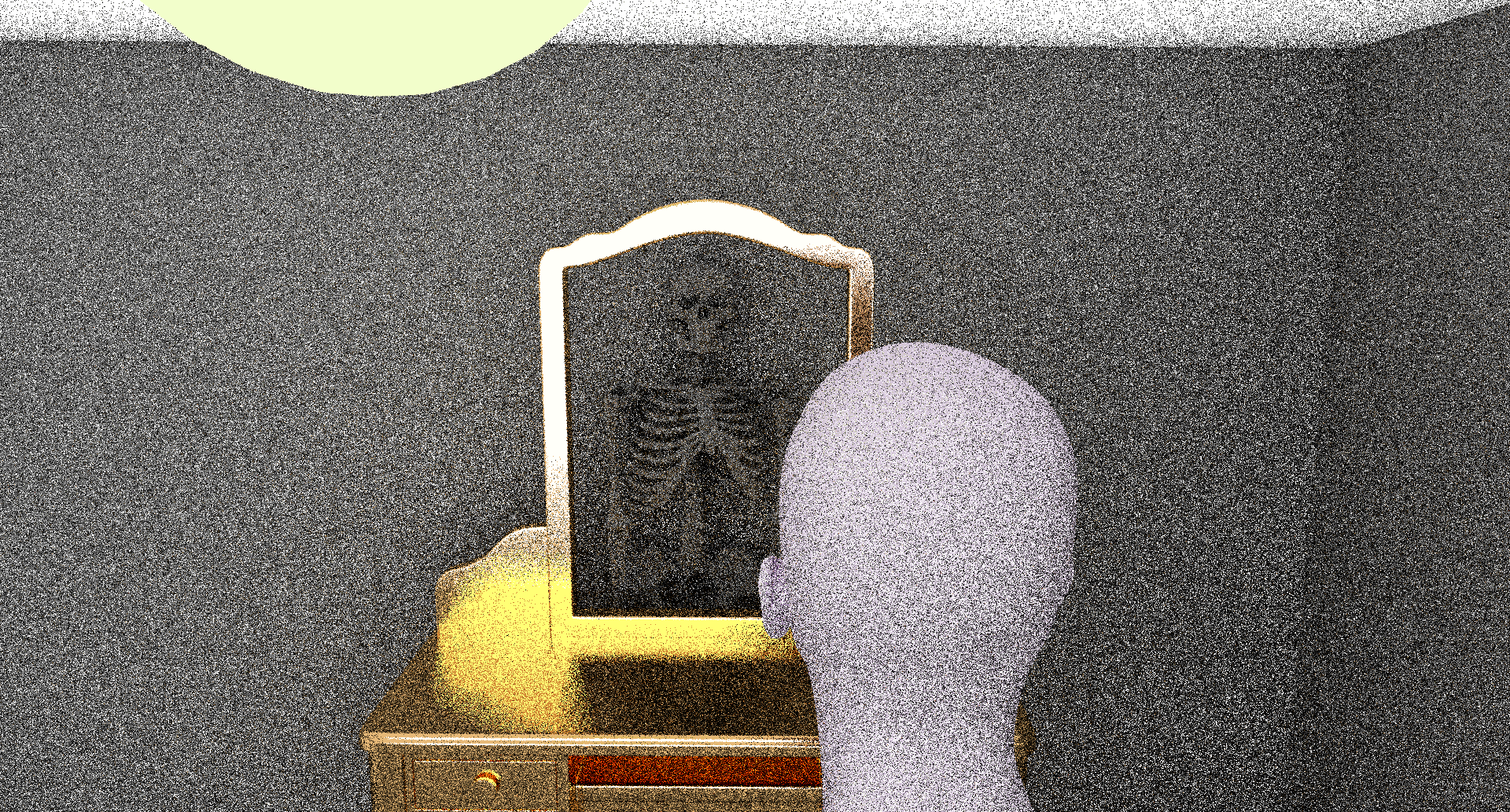 The theme for the final project was 'it's what's on the inside that counts'. My partner and I decided to create a scene of a person looking into a mirror and seeing their own skeleton. We also implemented some new features, including a disk feature with texture mapping.